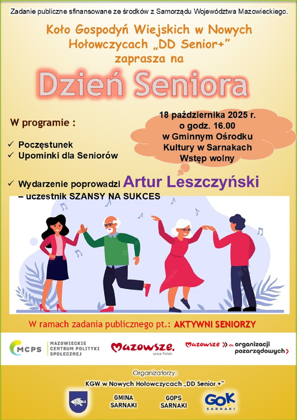 Spotkanie odbędzie się w ramach zadania publicznego „Aktywni seniorzy”, finansowanego ze środków Samorządu Województwa Mazowieckiego. Organizatorami wydarzenia są: KGW w Nowych Hołowczycach „DD Senior+”, Gmina Sarnaki, Gminny Ośrodek Pomocy Społecznej w Sarnakach oraz Gminny Ośrodek Kultury w Sarnakach.