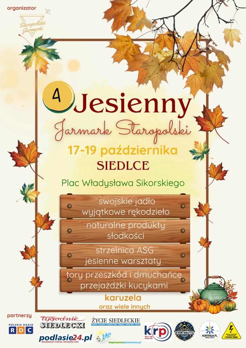 Jesień w Siedlcach zapowiada się wyjątkowo barwnie! Po raz czwarty serce miasta wypełni się zapachem tradycyjnych potraw, dźwiękiem ludowej muzyki i kolorami rękodzieła z całej Polski i nie tylko. Staropolskie Jarmarki z dumą zapraszają mieszkańców regionu oraz turystów na 4. Jesienny Jarmark Staropolski, który odbędzie się w dniach 17-19 października na placu Władysława Sikorskiego w Siedlcach.