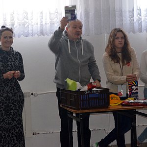 W tym roku zbieraliśmy pieniądze na sprzęt medyczny dla pediatrii, kardiochirurgii, onkologii oraz godną opiekę ludzi w podeszłym wieku. Akcję rozpoczęliśmy 9 stycznia. Niezapomnianych wrażeń dostarczyła nam licytacja zorganizowana po raz pierwszy na terenie naszej szkoły. Artur Malinowski doskonale wcielił się w rolę licytatora. Zmotywował dzieci, nauczycieli i pracowników szkoły do licytowania kubków, kominów, koszulek, słodyczy, piłki, plecaka, starterów play i innych gadżetów. Z licytacji uzyskaliśmy kwotę 423 zł. Dzięki zaangażowaniu wolontariuszy, nauczycieli i społeczności lokalnej zebraliśmy 1420 zł.