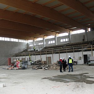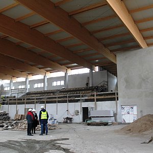 W piątek, 5 lutego, wspólnie z wicestarostą Martą Sosnowską i kierownik Wydziału Inwestycji, Rozwoju i Promocji Starostwa Powiatowego Urszulą Woźniak odwiedziliśmy plac budowy. O kulisach realizacji zadania opowiedział nam Marcin Bosek, kierownik robót w firmie Zeltech. Przy budowie pracuje codziennie kilkanaście osób. Dźwigary z klejonego drewna, stanowiące konstrukcję dachu wykonywane były w Niemczech. Żeby je w całości przywieźć do Sokołowa trzeba było skomplikowanej operacji logistycznej - trasa przejazdu, omijająca drogowe przeszkody, biegła przez Zambrów.