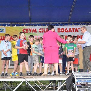 Życzenia dzieciom złożyła również wójt gminy Repki Krystyna Mikołajczuk-Bohowicz. Jarmark rozpoczęto biegiem ulicznym. W grupie wiekowej uczniowie kl. I-III, w kategorii dziewczęta pierwsza przebiegła trasę Monika Chmielewska, druga była Karolina Wrzesień, trzecia Weronika Czapska. W kategorii chłopcy pierwszy był Michał Tomczak, drugi, Miłosz Żachowski, trzeci Kacper Sosna.W grupie uczniowie kl. IV-VI w kategorii dziewczęta najszybciej biegła Magdalena Pingwara, druga przybiegła Monika Sawicka, trzecia Julia Wojtczuk. Z chłopców najszybszy okazał się Łukasz Paprocki, drugi był Oskar Sawicki, trzeci Marcin Adamczuk. W grupie ? osoby powyżej 17 roku życia najlepsza w biegu była Wioletta Adamczuk, druga była Iwona Floryszczyk, trzecia Martyna Adamczuk. W kategorii mężczyzn pierwszy pokonał trasę Sławomir Krasnodębski, drugi był Andrzej Adamczuk. Wszyscy uczestnicy biegu otrzymali medale Zwycięzcy zaś udekorowani zostali przez panią wójt medalami złotymi, srebrnymi i brązowymi. Najmłodsi i najstarsi uczestnicy otrzymali statuetki. Szczęśliwcem, który wylosował rower ufundowany przez Powiatowy Bank Spółdzielczy w Sokołowie Podl. oraz ?Młyn Braci Górskich? w Repkach okazał się pan Sławomir Krasnodębski.