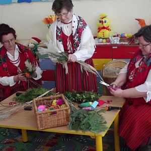 Jedna z pań opowiadała o zwyczajach związanych z Niedzielą Palmową, a w tym czasie na oczach dzieci powstawały palmy wielkanocne. Potem było oglądanie tradycyjnie ozdabianych pisanek . Podczas spotkania przedszkolaki śpiewały piosenki o tematyce wielkanocnej oraz zaprosiły gości do wspólnych pląsów i śpiewów. Następnie złożyły życzenia i wręczyły własnoręcznie wykonane pisanki. Pani dyrektor Renata Krupa dołączyła się do życzeń oraz podziękowań.