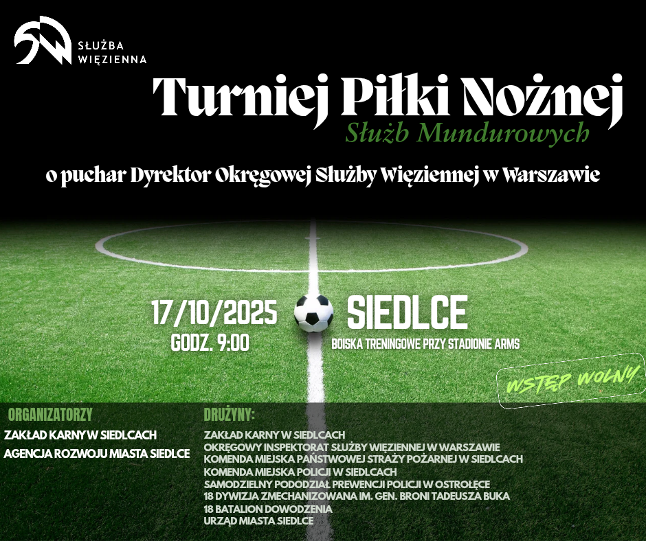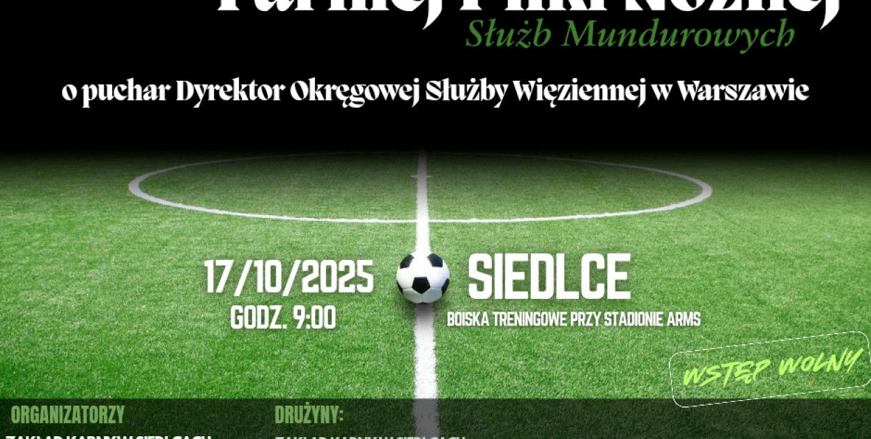Już jutro, 17 października, o godz. 9:00 na boiskach treningowych przy stadionie Agencji Rozwoju Miasta Siedlce odbędzie się Turniej Piłki Nożnej Służb Mundurowych o Puchar Dyrektor Okręgowej Służby Więziennej w Warszawie. W sportowej rywalizacji udział wezmą drużyny reprezentujące siedleckie i mazowieckie służby mundurowe oraz Urząd Miasta Siedlce.