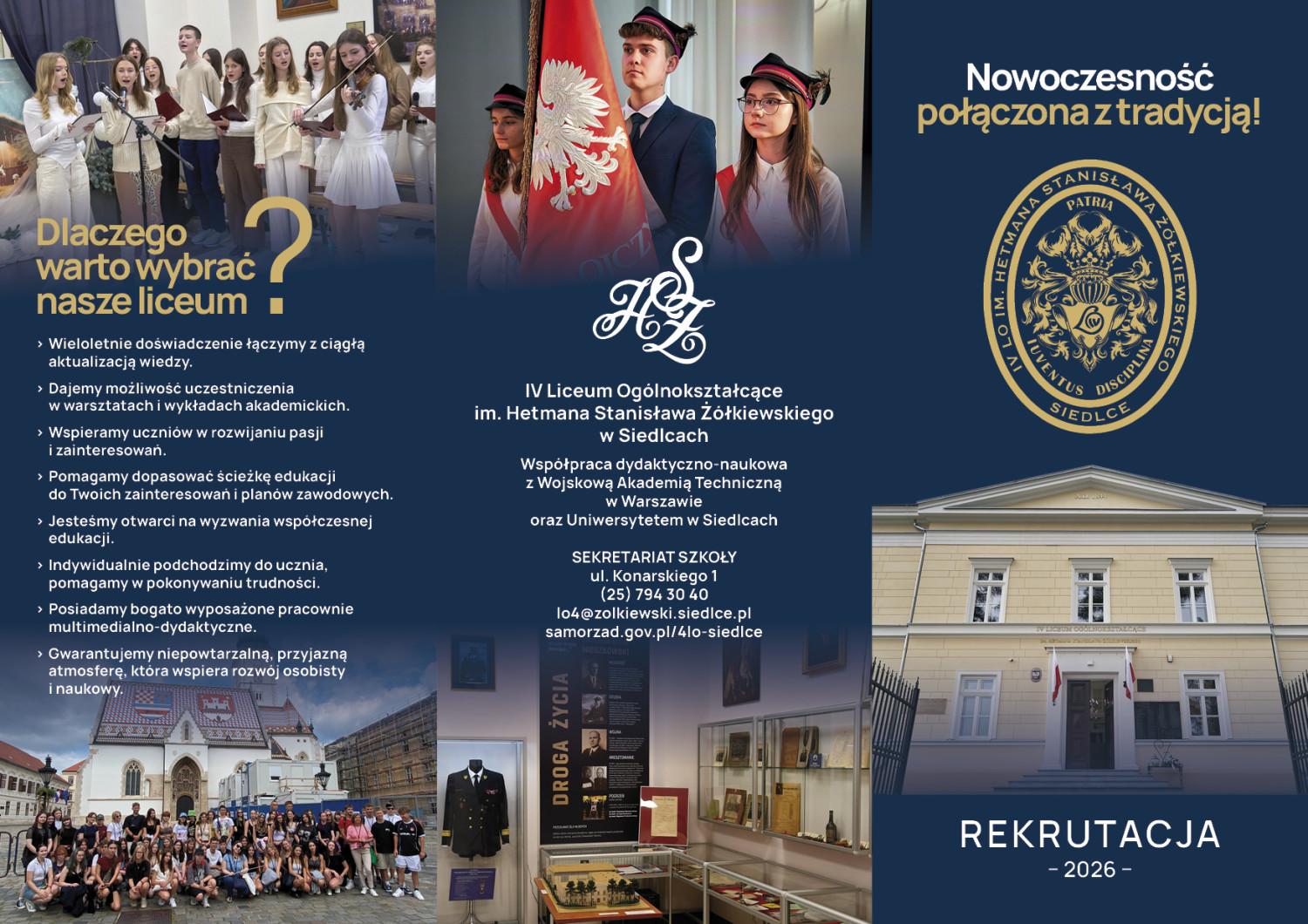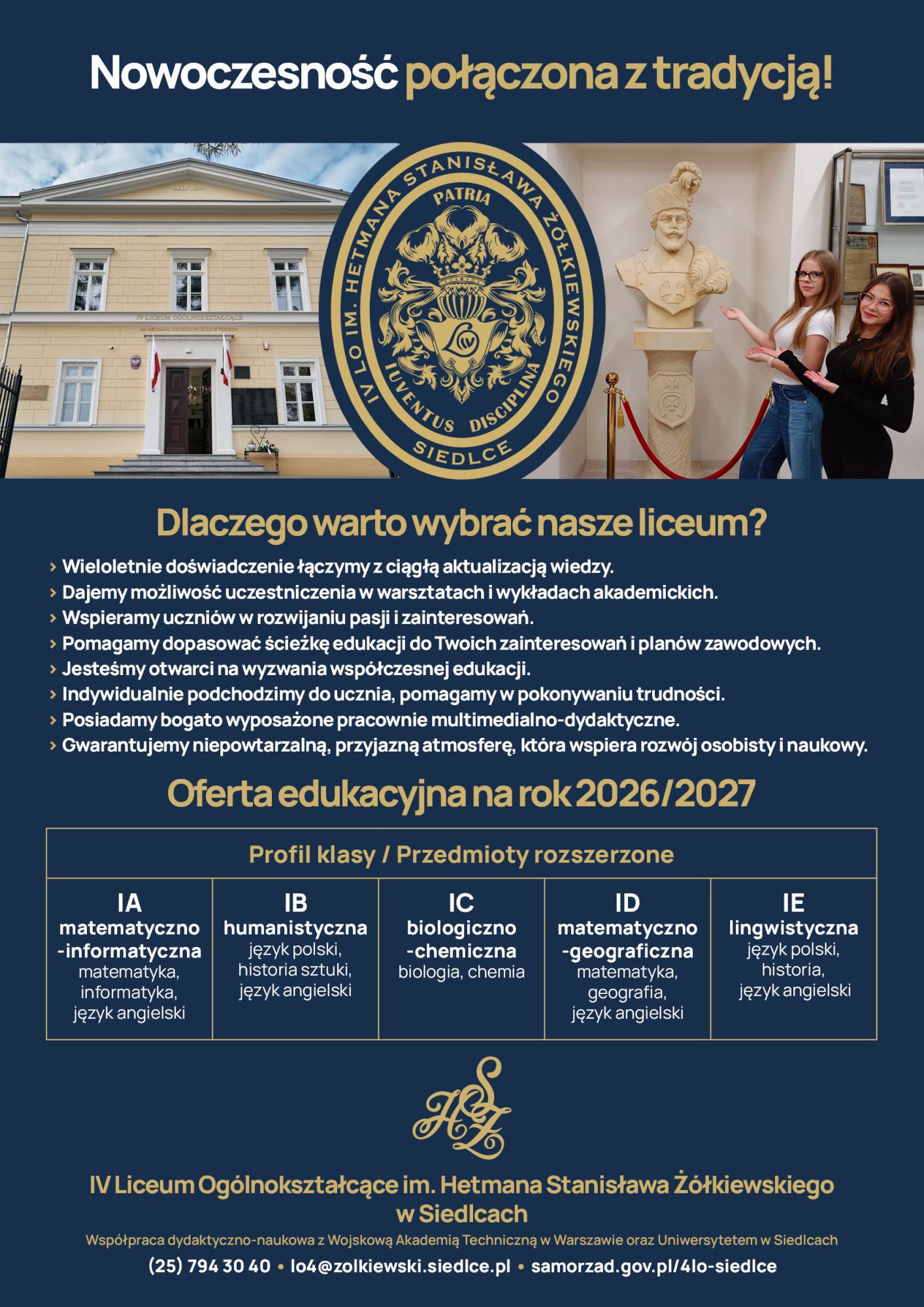 Zastanawiasz się, jaką szkołę wybrać? Chcesz poczuć atmosferę miejsca, w którym spędzisz najbliższe lata? A może po prostu jesteś ciekawy, jak wygląda życie w liceum „od kuchni”? IV Liceum Ogólnokształcące im. Stefana Żółkiewskiego w Siedlcach ma dla Ciebie idealną propozycję!