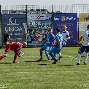 Początek drugiej połowy nie przyniósł większych emocji. W 52 minucie koncentrację Smołucha sprawdził Michał Cywiński. Siedlczanie długo czekali na stworzenie zagrożenia pod bramką rywali. Po wrzutce Olszewskiego z rzutu rożnego Rzepecki nie zapanował nad piłką, ale Walków nie zdołał wygarnąć piłki golkiperowi przyjezdnych. W 67 minucie padł kuriozalny gol dla Pogoni. Jakub Ostrowski został nabity przez Błyszkę, co zaskoczyło Rzepeckiego. Po swojaku na tablicy pojawiło się 3:0 dla gospodarzy. Na kwadrans przed końcem rezerwowy Sebastian Pociecha przestrzelił z ostrego kąta. W 87 minucie Pogoń skonstruowała kapitalną akcję. Po wrzutce Walkowa setkę miał Marciniec, lecz Rzepecki popisał się skuteczną interwencją. Niewykorzystana sytuacja zemściła się momentalnie. Honorową bramkę dla Błękitnych zdobył po strzale z głowy aktywny od pierwszych minut Rogala. Ostatnie słowo należało do siedlczan. W ostatniej akcji meczu Walków pokonał Rzepeckiego w sytuacji sam na sam. Asystował Pociecha. Pogoń wygrała 4:1.