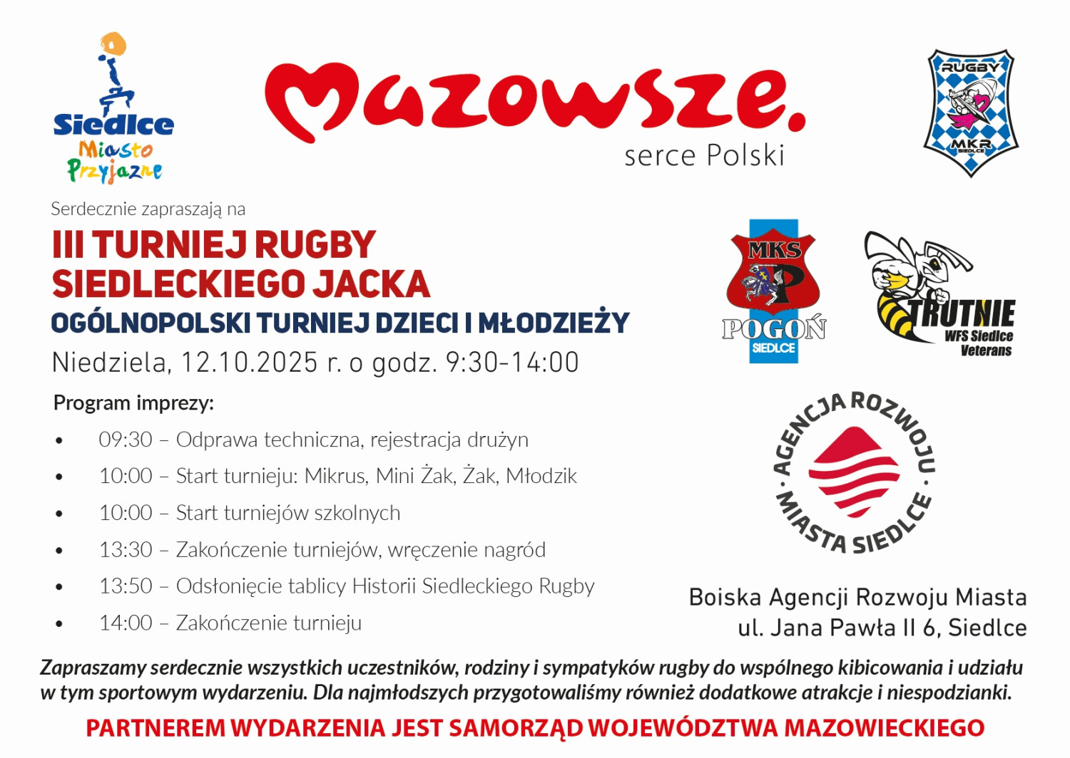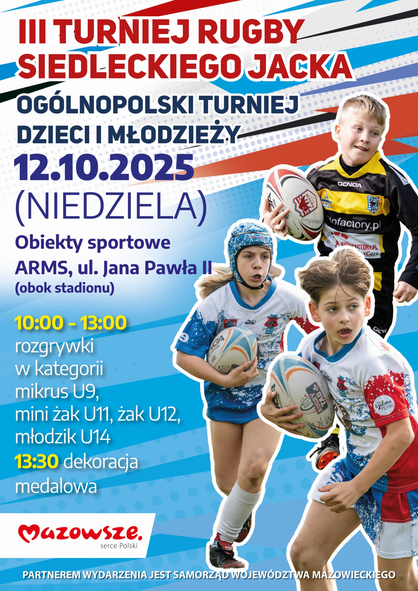 W niedzielę, 12 października, Siedlce zamienią się w stolicę młodego rugby. Na boiskach przy ul. Jana Pawła II odbędzie się III Ogólnopolski Turniej Rugby Siedleckiego Jacka, który zgromadzi młodych zawodników z całej Polski, oferując sportowe emocje i liczne atrakcje dla całych rodzin.
