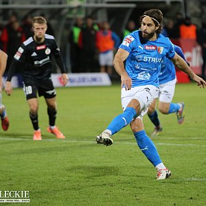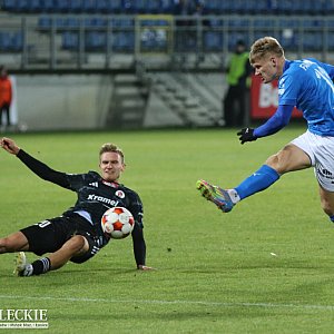 Pierwsze minuty nie przyniosły większych emocji, ale w 17. minucie łodzianie objęli prowadzenie po uderzeniu Michała Mokrzyckiego z dystansu. Po tym golu gra Pogoni zaczęła się układać lepiej, a gospodarze coraz częściej gościli pod bramką rywala. W końcówce pierwszej połowy ich determinacja przyniosła efekt – po rzucie wolnym i zgraniu Karola Podlińskiego piłkę do siatki skierował Ernest Dzięcioł. Do przerwy był remis 1:1.