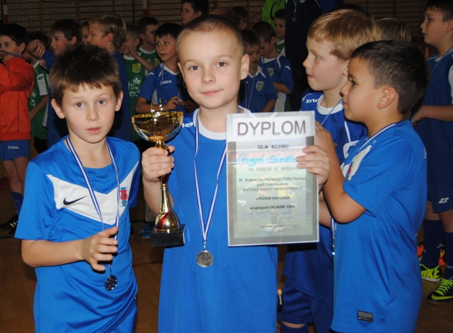 Młodzi adepci piłki nożnej z rocznika 2005, reprezentujący klub MKP ?Pogoń Siedlce?, wzięli udział w kolejnym turnieju piłki nożnej. W Warszawie rywalizowali z 12 drużynami ze świetnym efektem.Chłopcy, trenowani przez Macieja Anusiewicza, po niedawnym sukcesie odniesionym podczas rozgrywek Goran Cup (październik 2013 r. ? II miejsce), tym razem 30 listopada uczestniczyli w turnieju Orzeł Cup, zorganizowanym przez stołeczny klub UKS Orzeł Warszawa. Trener na warszawski turniej, zdecydował się zabrać dwie grupy młodych piłkarzy, którzy stanęli do walki z dwunastoma drużynami, reprezentującymi Warszawę i okolice (m.in. CWKS Legia Bemowo, UKS Orzeł Warszawa). Siedleccy piłkarze dzielnie walczyli w grupie A i B, nie odnosząc w fazie grupowej ani jednej porażki. Kolejno gromili kolejnych rywali, osiągając wyniki 8:0, 4:0, 3:0 itp., sami tracąc zaledwie kilka goli.Mecz finałowy odbył się w niezwykłej atmosferze. 8-letni chłopcy, dotychczas głodni zdobywania kolejnych bramek, zdeterminowani do walki, nieustępliwi i zmagający się o każdą piłkę, w finale zachowali się jak dorośli, dojrzali zawodnicy. Stając do ?bratobójczej? rozgrywki, nie cieszyli się ze zdobywanych goli, unikali ostrych starć, po niezamierzonych faulach pomagali rywalowi szybko stanąć na nogi, zaś po zakończonym meczu wspólnie gratulowali sobie nawzajem udanego występu w warszawskiej hali Wyższej Szkoły Menadżerskiej i wraz z trenerem odśpiewali gromkie ?Tak się bawi Pogoń Siedlce?.Turniej zakończył się dekoracją zwycięzców, wręczeniem pucharów, dyplomów, medali oraz nagród indywidualnych, z których jedną otrzymał reprezentant siedleckiej Pogoni ? Oliwier Kryszczuk (najlepszy strzelec turnieju).Gratulujmy trenerowi Maciejowi Anusiewiczowi i jego podopiecznym z MKP ?Pogoń Siedlce? kolejnego, udanego występu. Chłopcom dziękujemy za tak wspaniałe reprezentowanie naszego miasta i życzymy dalszych sukcesów.
