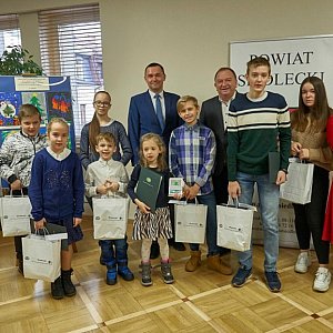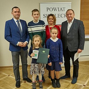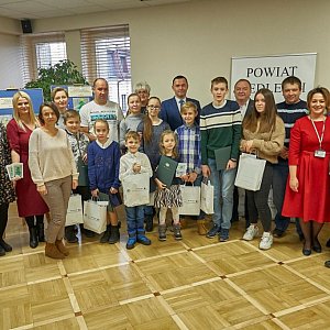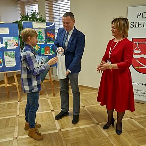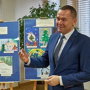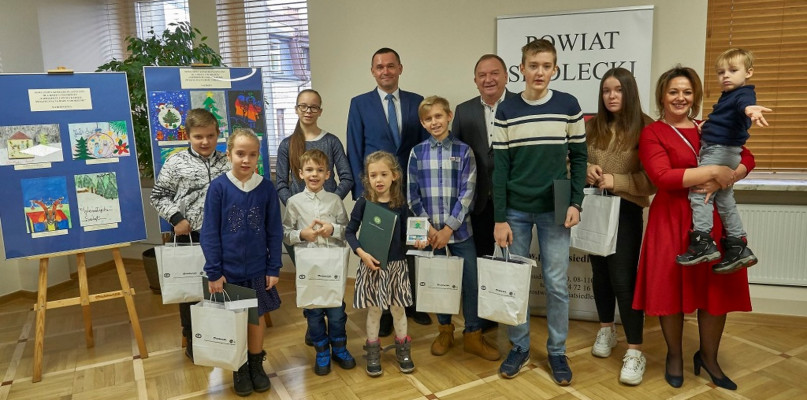 Starosta siedlecki Karol Tchórzewski wraz z współpracownikami wręczył nagrody laureatom Powiatowego Konkursu Plastycznego dla Dzieci i Młodzieży „Zaprojektuj swoją kartkę świąteczną na Boże Narodzenie”.