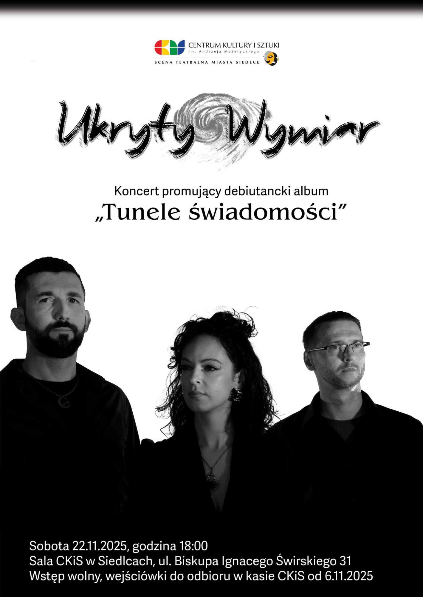 22 listopada o godz. 18:00 na Scenie Teatralnej Miasta Siedlce odbędzie się koncert zespołu Ukryty Wymiar, który zaprezentuje materiał ze swojego debiutanckiego albumu „Tunele świadomości”.