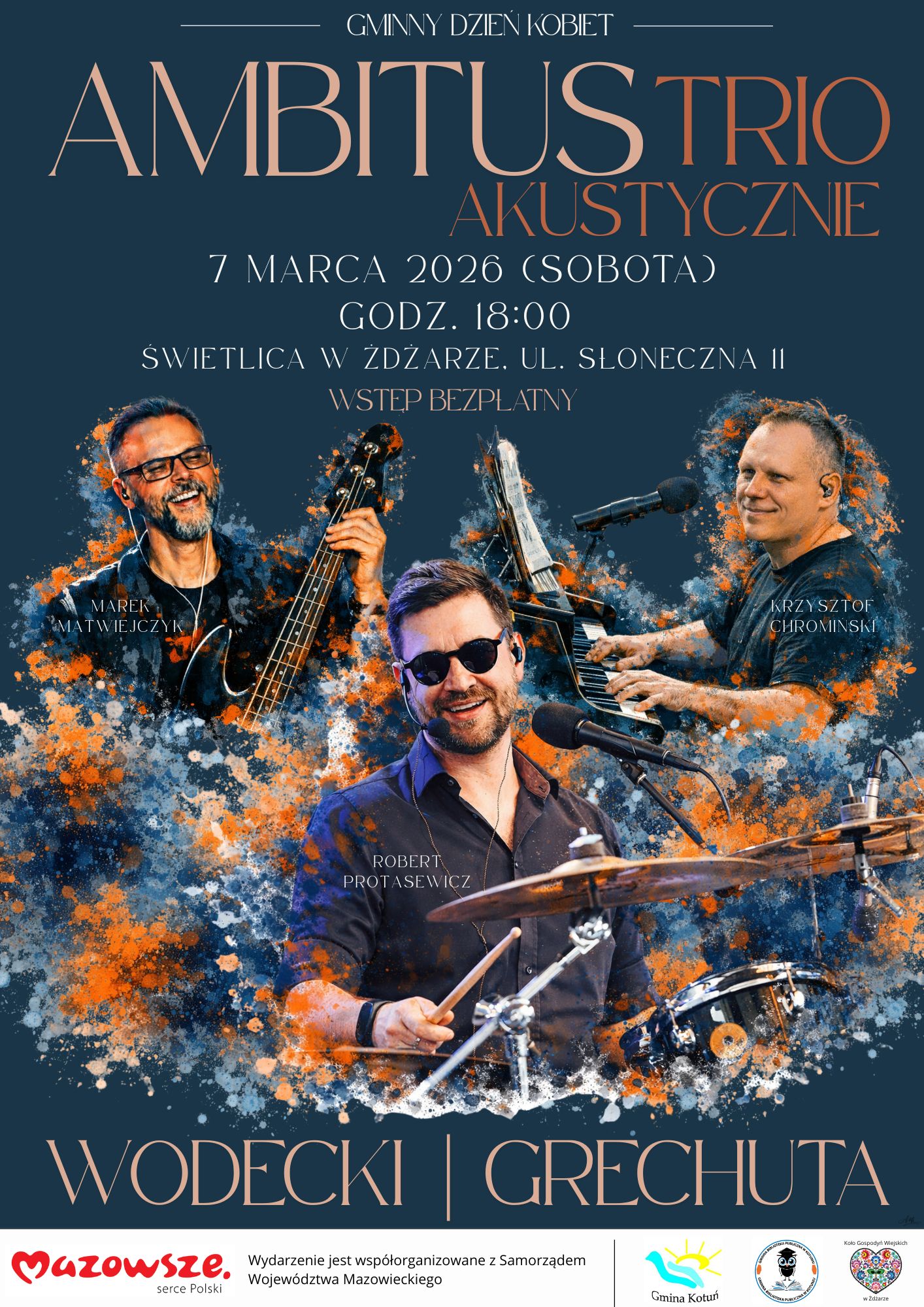 Serdecznie zapraszamy na niezwykłe, muzyczne spotkanie z twórczością dwóch legend polskiej piosenki „Wodecki | Grechuta – akustycznie” to koncert pełen emocji, pięknych melodii i ponadczasowych tekstów autorstwa m.in. Jonasza Kofty, Agnieszki Osieckiej, Wojciecha Młynarskiego, Adama Mickiewicza oraz Konstantego Ildefonsa Gałczyńskiego, które od lat poruszają kolejne pokolenia słuchaczy.Usłyszymy m.in. takie utwory jak: „Zacznij od Bacha” „Lubię wracać tam, gdzie byłem” „Rzuć to wszystko, co złe” „Nie dokazuj” „Dni, których nie znamy” „Będziesz moją Panią” „Wiosna – ach to ty”…i wiele innych niezapomnianych piosenek. Koncert w subtelnych, eleganckich aranżacjach akustycznych wykona trio Ambitus w składzie:Robert Protasewicz – wokal, instrumenty perkusyjne Krzysztof Chromiński – fortepian Marek Matwiejczyk – akustyczna gitara basowa, kontrabas 7 marca 2026 r. (sobota) godz. 18:00 Świetlica w Żdżarze, ul. Słoneczna 11 Wstęp wolny Serdecznie zapraszamy wszystkich miłośników pięknej muzyki i poezji – to będzie wieczór pełen wzruszeń i wspomnień. Do zobaczenia! Wydarzenie jest współorganizowane z Samorządem Województwa Mazowieckiego