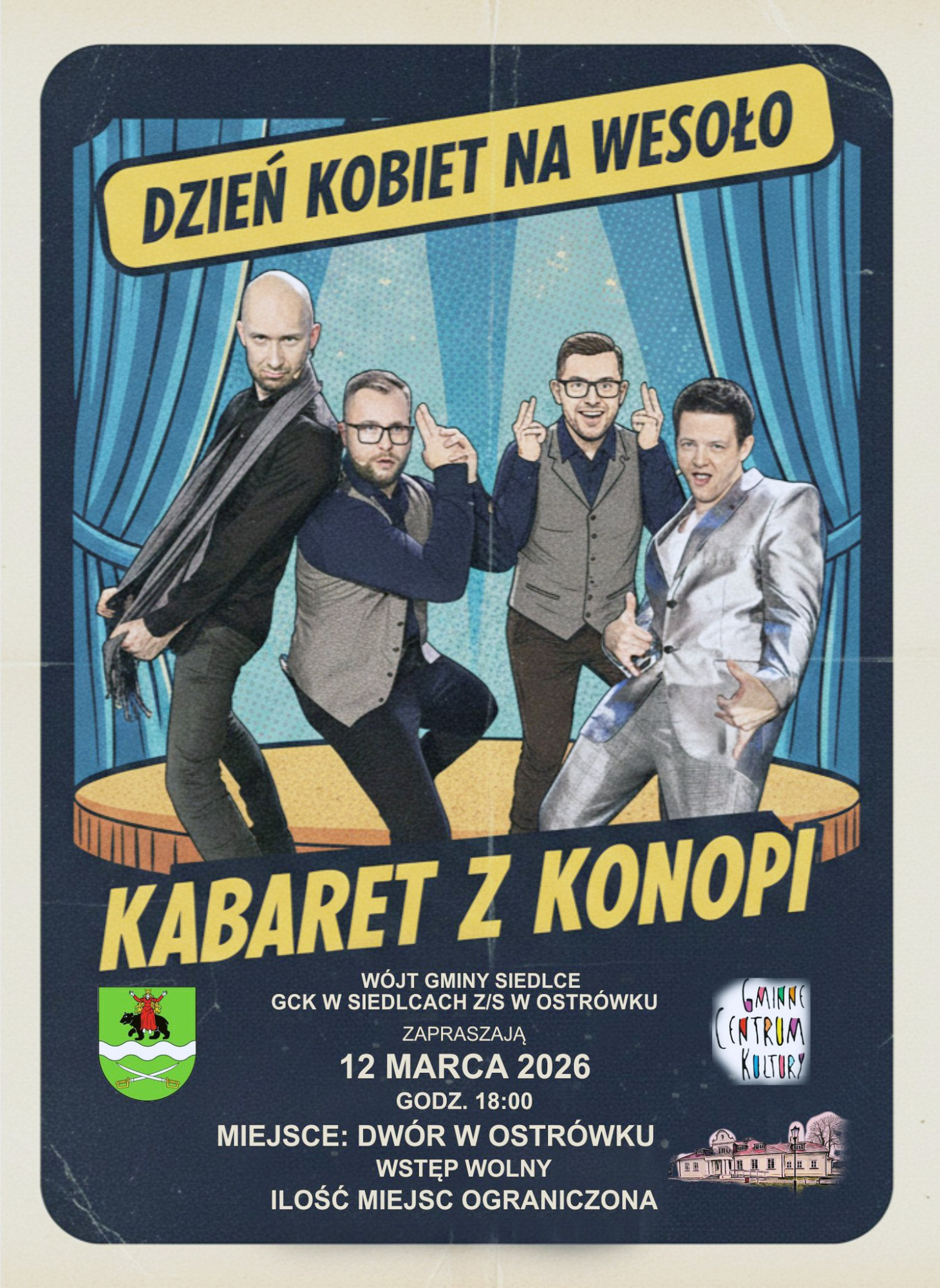 Już 12 marca o godz. 18:00 w Dworze w Ostrówku na scenie wystąpi Kabaret z Konopi – znany i lubiany zespół, który od lat bawi publiczność swoim charakterystycznym stylem i błyskotliwym humorem. Wieczór zapowiada się jako prawdziwa dawka śmiechu i świetnej zabawy, idealna do wspólnego świętowania Dnia Kobiet.