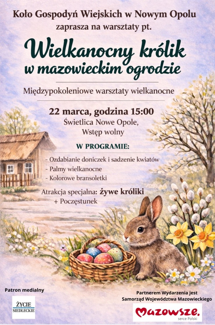 Nowe Opole przygotowuje się na nadchodzącą wiosnę i zbliżające się Święta Wielkanocne. Już 22 marca o godz. 15:00 w miejscowej świetlicy odbędą się międzypokoleniowe warsztaty pod hasłem „Wielkanocny królik w mazowieckim ogrodzie”. Udział w wydarzeniu jest bezpłatny.