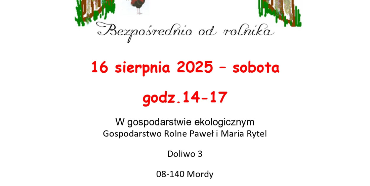 W sobotę, 16 sierpnia, w Doliwiu (Miasto i Gmina Mordy) odbędzie się wyjątkowe wydarzenie łączące konsumentów z rolnikami ekologicznymi. Gospodarzami spotkania „Otwarte Wrota” będą Maria i Paweł Rytlowie, właściciele certyfikowanego gospodarstwa ekologicznego, w którym odbędzie się impreza.