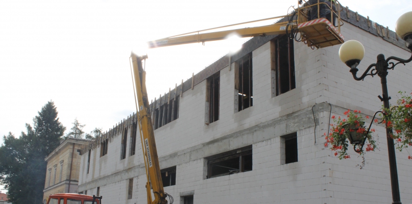 Wykonawca tzw. łącznika przy IV Liceum Ogólnokształcącym im. Hetmana Stanisława Żółkiewskiego w Siedlcach przygotowuje już więźbę dachową.