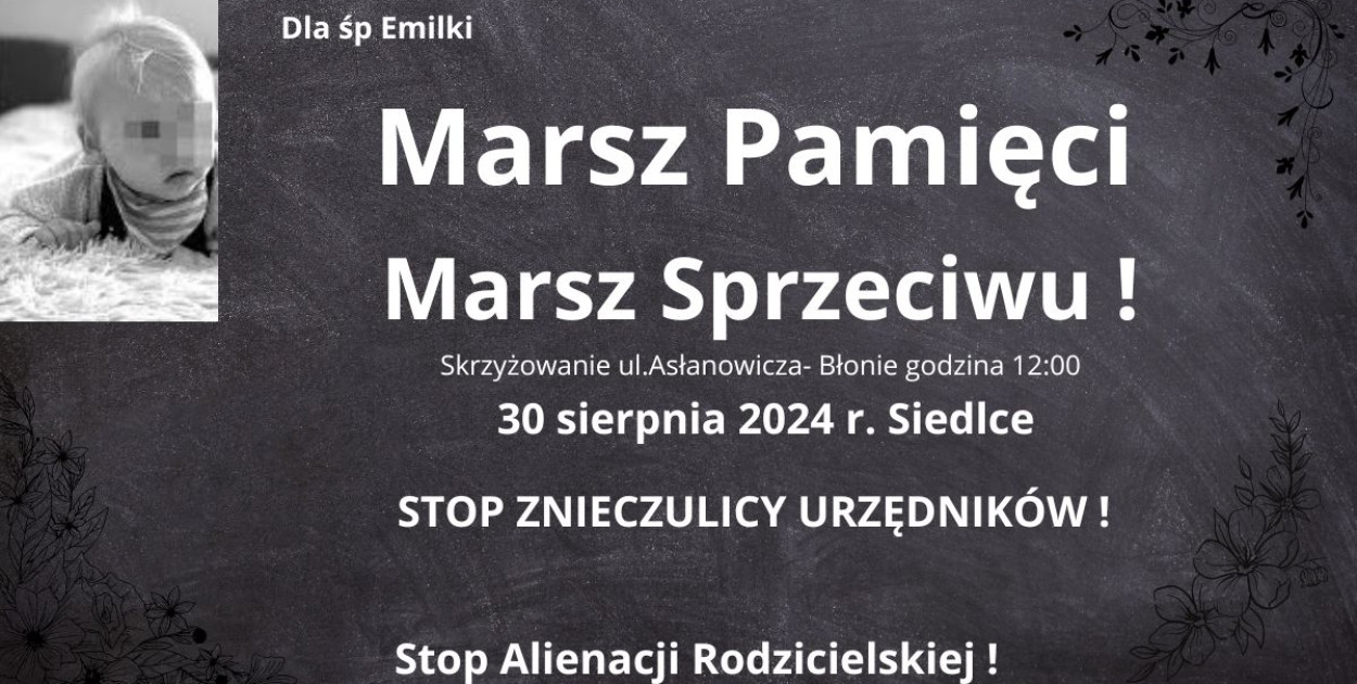 30 sierpnia (piątek) ulicami Siedlec przejdzie Marsz Pamięci i Marsz Sprzeciwu połączony z Protestem Ojców, który ma na celu upamiętnienie tragicznie zmarłej Emilki oraz wyrażenie dezaprobaty wobec zaniedbań instytucji odpowiedzialnych za opiekę społeczną.