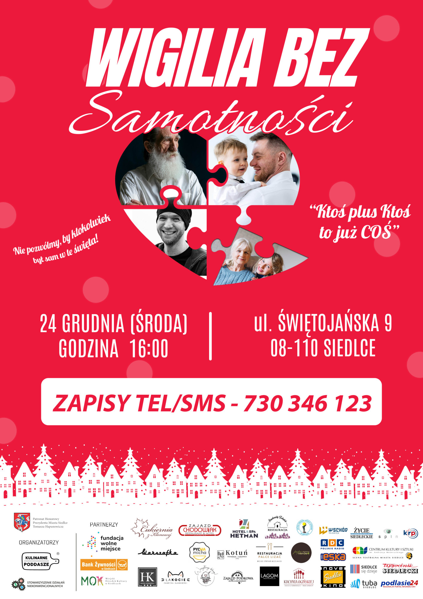 Tak 2 lata temu narodził się pomysł „Wigilii dla samotnych”. W tym roku czeka nas jego kontynuacja, tym razem pod nazwą: „Wigilia bez samotności”. To własna inicjatywa, która powstała we współpracy ze Stowarzyszeniem Działań Niekonwencjonalnych oraz Bankiem Żywności w Siedlcach. Wydarzenie objęli patronatem Fundacja „Wolne Miejsce” i honorowo Prezydent Miasta Siedlce.