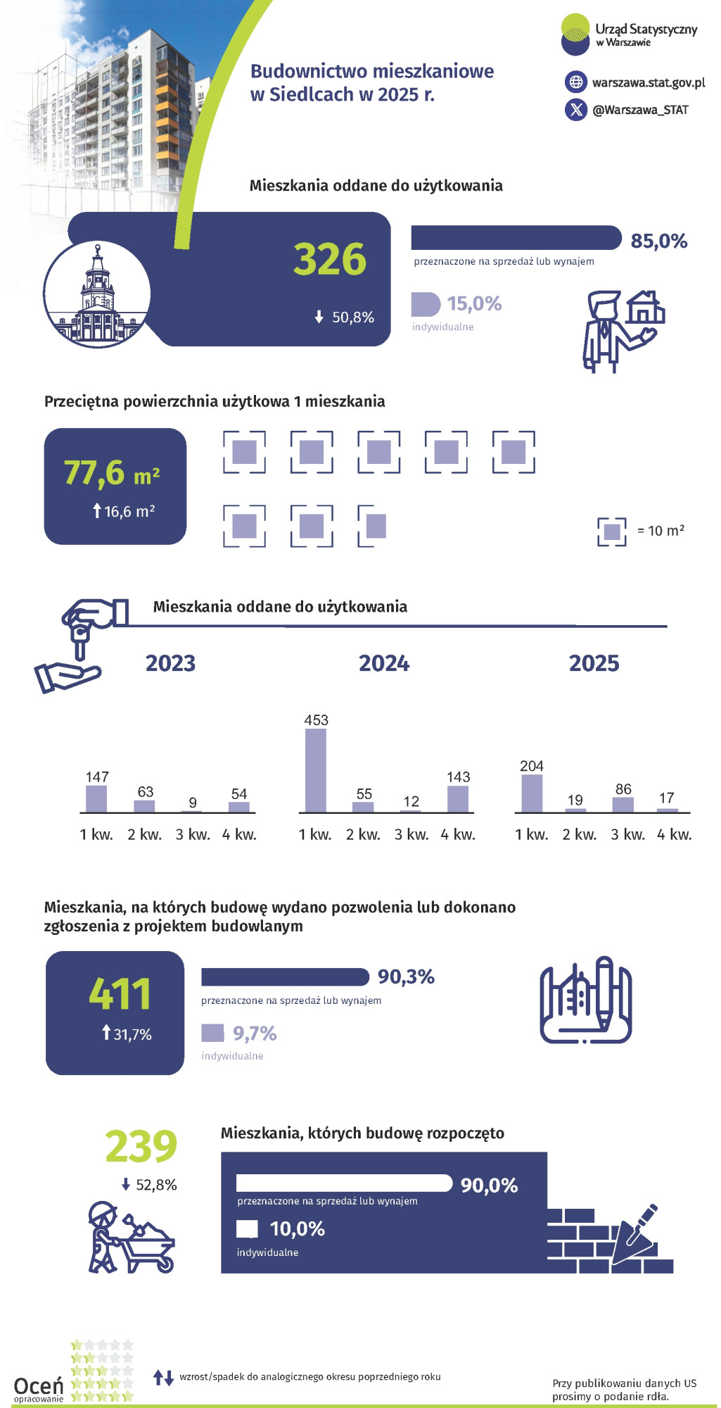 W minionym roku przekazano tu do użytkowania 326 mieszkań i liczba ta zmniejszyła się o blisko 51% w porównaniu z 2024 r. Najwięcej było mieszkań wybudowanych przez deweloperów – 85%. Przeciętna powierzchnia użytkowa 1 mieszkania była większa niż rok wcześniej i wyniosła 77,6 m kw. W latach 2023-2025 najwięcej mieszkań oddano w pierwszym kwartale 2024 r. – 453.