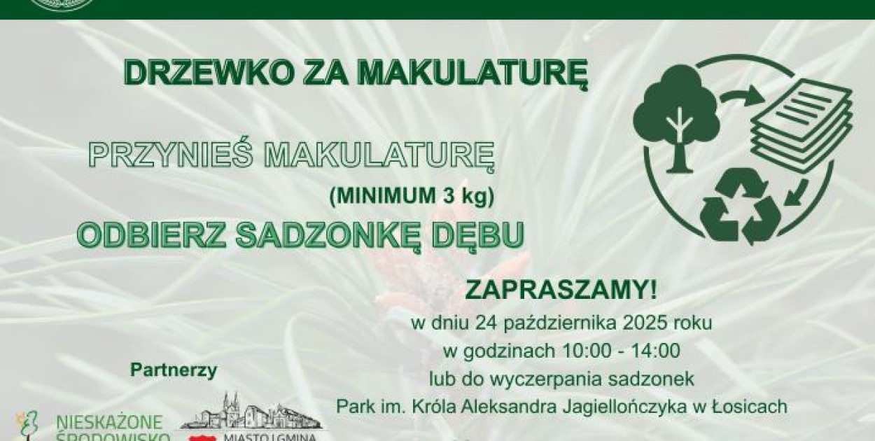 Stosy starego papieru zalegają w domu? Czas zrobić z nimi coś dobrego! Już 24 października w Parku im. Króla Aleksandra Jagiellończyka w Łosicach odbędzie się wyjątkowa akcja: przynieś makulaturę, a w zamian otrzymasz młode drzewko dębu.