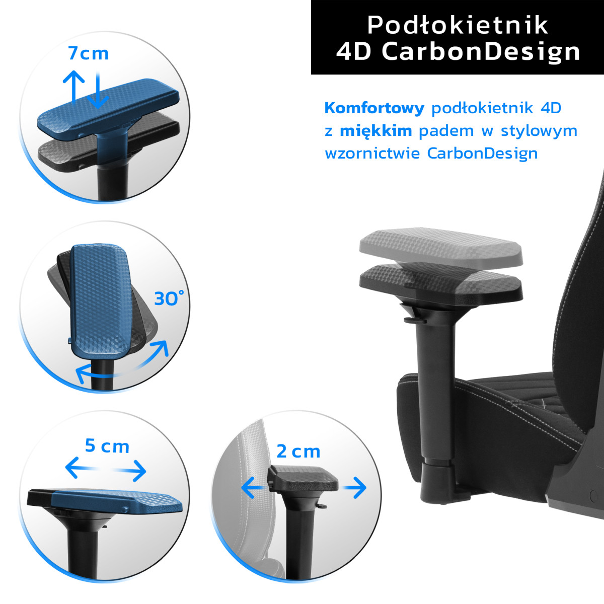 Podłokietniki 4D CarbonDesign dają pełną swobodę – można je przesuwać w górę i w dół, do przodu i do tyłu, na boki, a także zmieniać ich rozstaw. To oznacza, że każdy użytkownik jest w stanie dopasować je do wysokości biurka, szerokości ramion czy indywidualnych nawyków pracy i grania. Tak precyzyjna regulacja to jeden z największych atutów krzeseł gamingowych Gamvis, który znacząco podnosi komfort codziennego użytkowania.