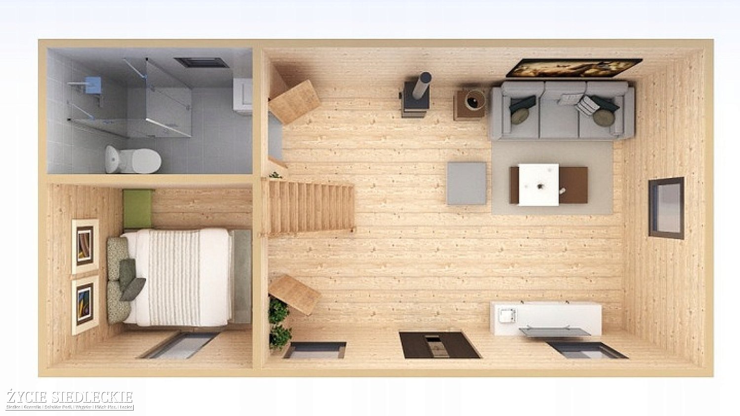 W standardzie domek wyposażony jest w schody stałe prowadzące na antresolę. W ofercie posiadamy również schody rozkładane – wybór zależy od preferencji klienta.