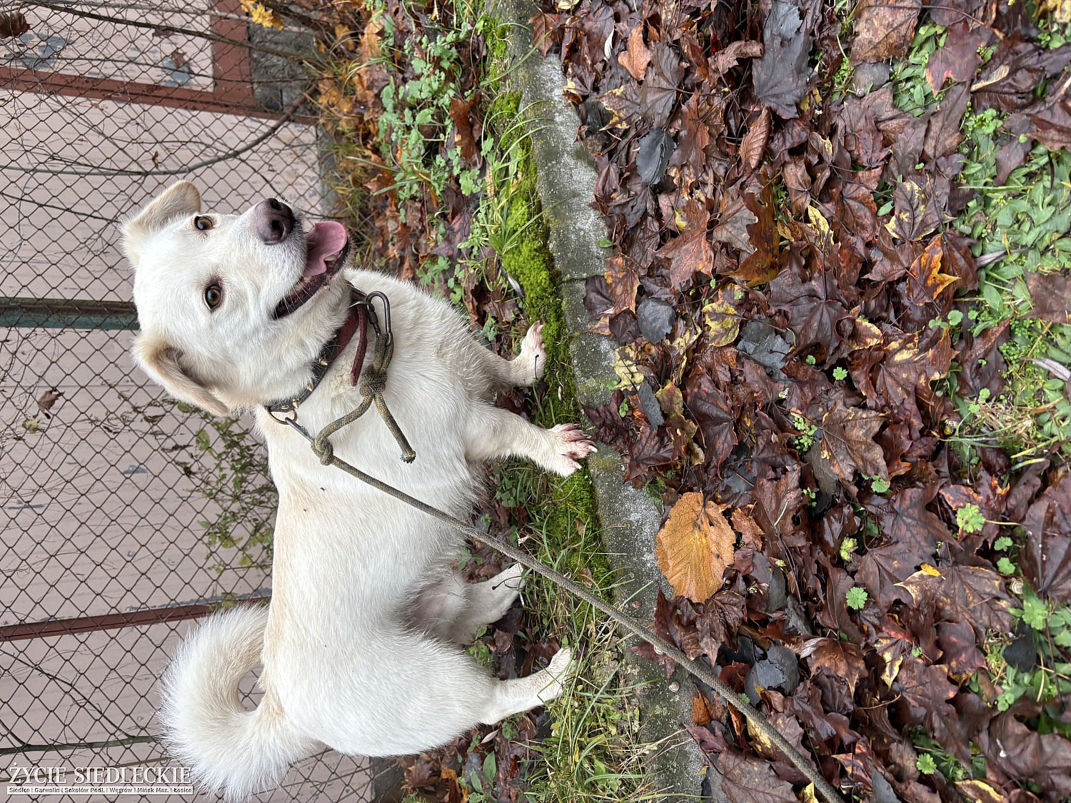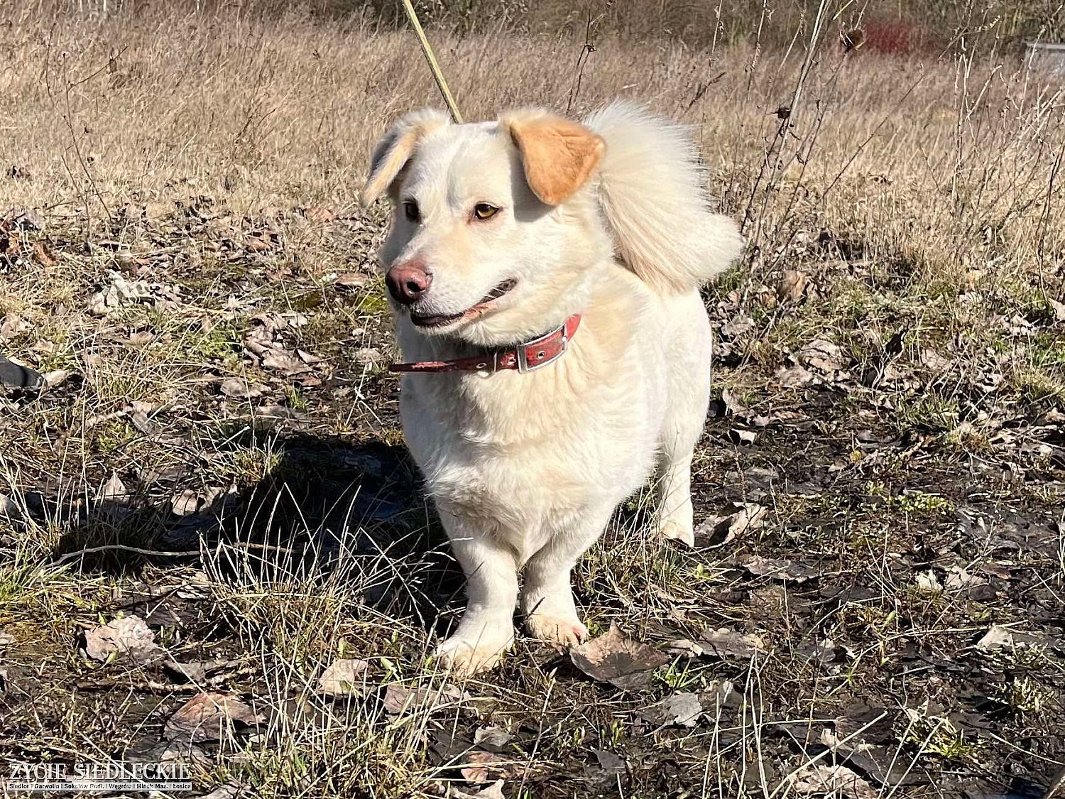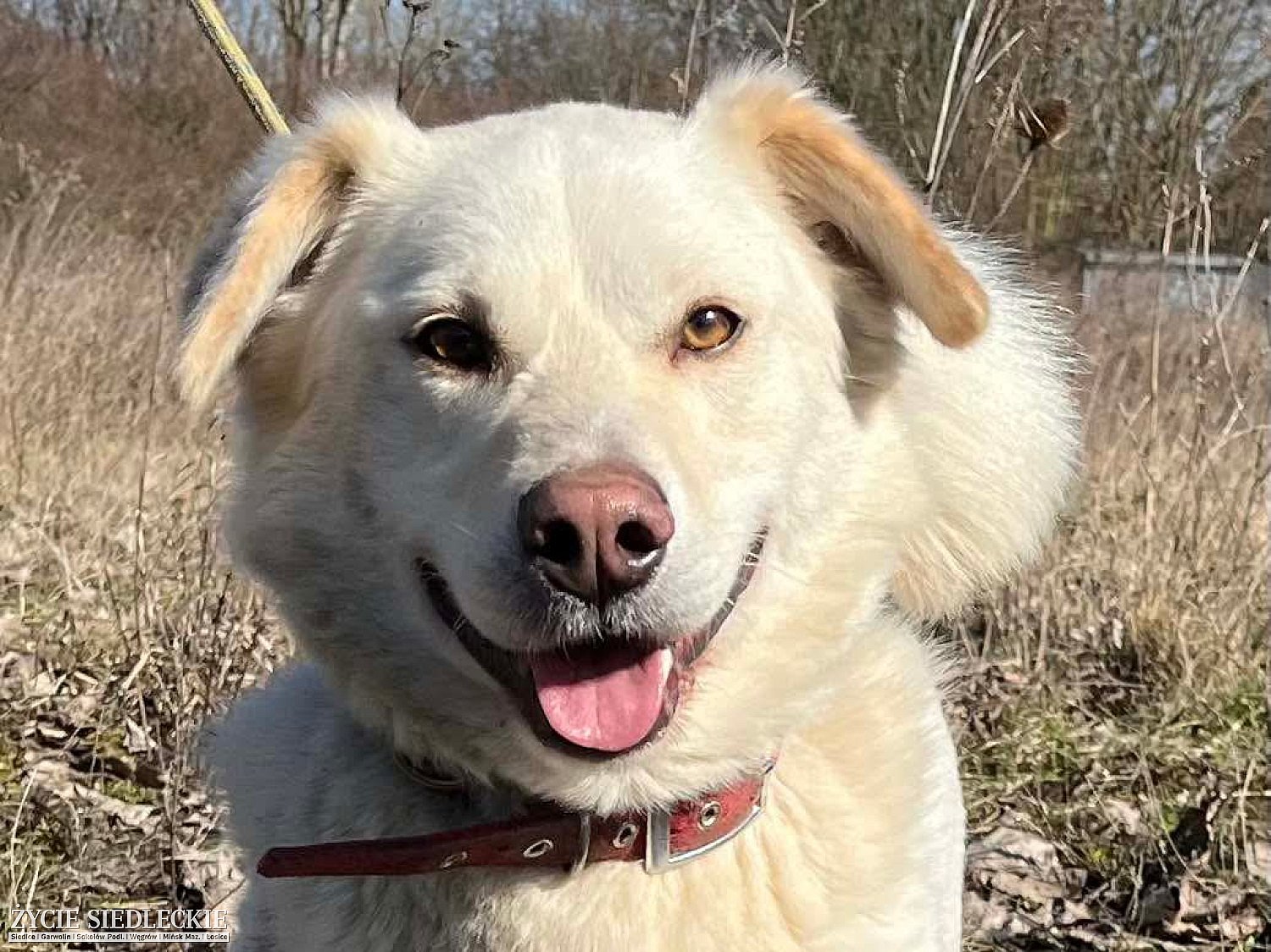 Poznajcie Biszkopta, uroczego, biało umaszczonego psiaka! Ma około 4-5 lat, a jego serce