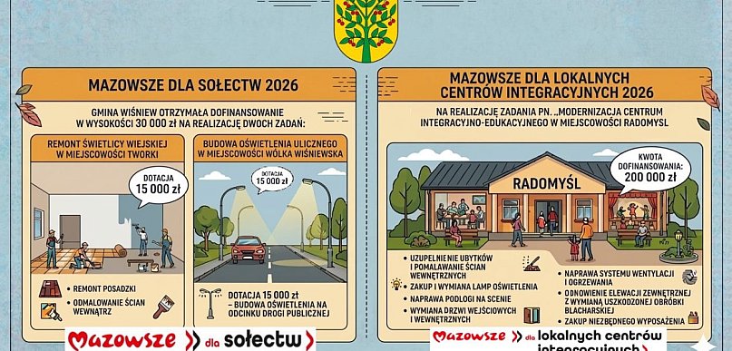 Radomyśl, Tworki i Wólka Wiśniewska – w tych trzech miejscowościach, dzięki skuteczności władz gminy i wsparciu z budżetu województwa, ruszy realizacja kluczowych dla mieszkańców inwestycji. Zmodernizowane centrum integracyjne, odnowiona świetlica i nowe oświetlenie drogowe to konkretne zmiany, które przez lata będą służyć lokalnej społeczności.